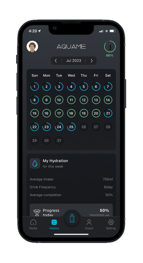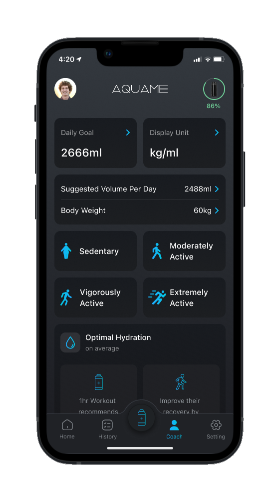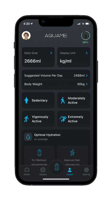 AQUAME 2.0's Hydration Coach creates personalised hydration plans, factoring in your lifestyle and physical activity, to ensure you meet your unique hydration needs.